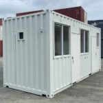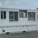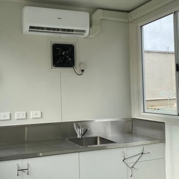 This is a 20′ standard single use container, fitted out with two stainless steel work stations – with sinks. And in a separate compartment, there is a toilet and shower. The unit is fully insulated, has an AC fitted and vinyl floor throughout.
